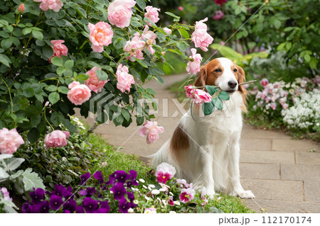 ピンクの薔薇をくちに咥えるキザな中型犬コーイケルホンディエ