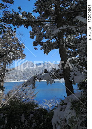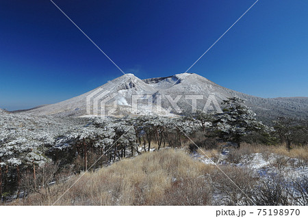 六観音堂鳥居と灯籠のバックに座る御池大杉と雪を被った韓国岳