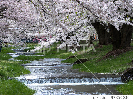 福島県、観音川の桜並木。ピンク色の桜と川の流れとのコラボレーションが綺麗