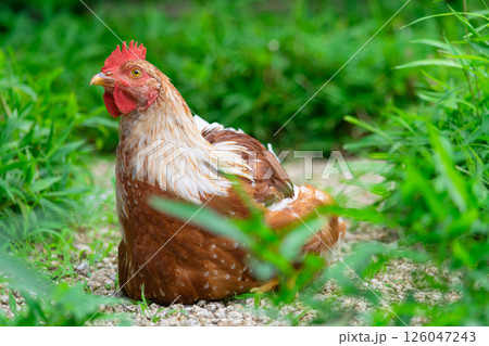 緑生える庭で寛ぐニワトリ