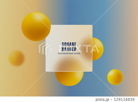 Glassmorphism square banner with yellow spheres on gradient background