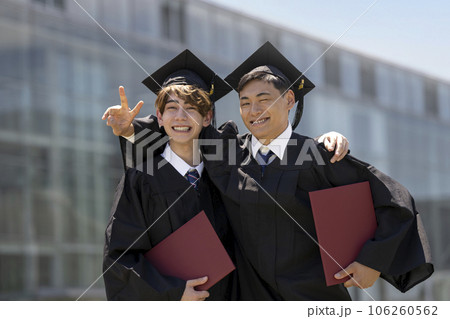 アカデミックガウンを着た2人の男子学生 卒業式 イメージ