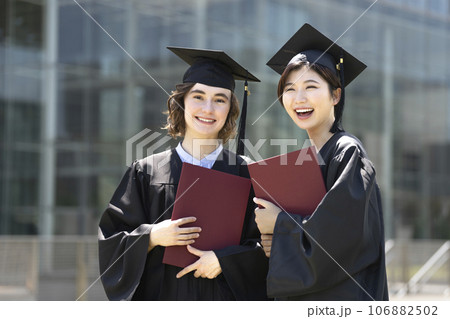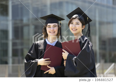 アカデミックガウンを着た2人の女子学生 卒業式 イメージ