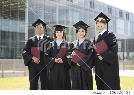 アカデミックガウンを着た4人の学生 卒業式 イメージ
