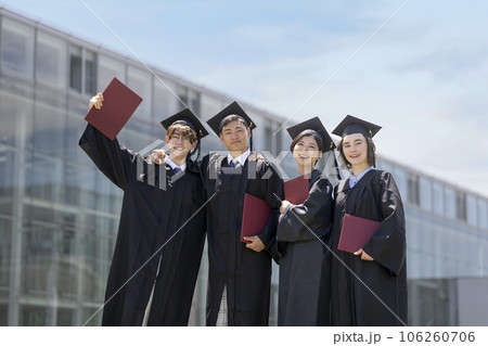 アカデミックガウンを着た4人の学生 卒業式 イメージ