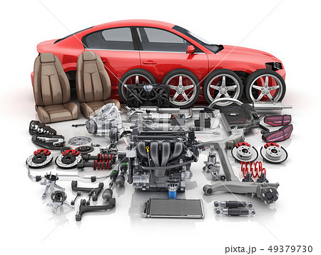 Red car body disassembled and many vehicles parts