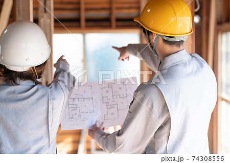住宅建築現場で働く人々 スケルトンリフォーム 打ち合わせ
