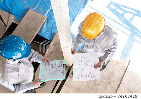 住宅建築現場で働く人々 スケルトンリフォーム 打ち合わせ 見下ろす