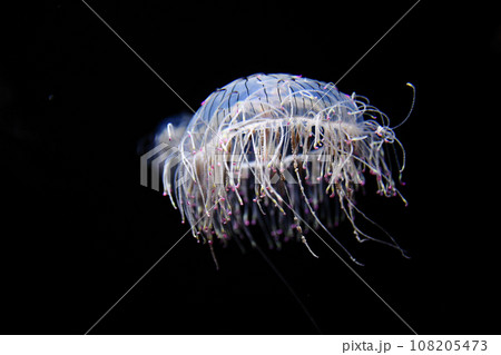 South American sea nettle jelly fish swim underwater aquarium pool with pink neon light