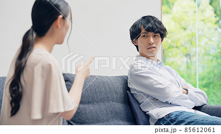 お互いに指を差し合い言い訳をする若い夫婦のイラスト素材