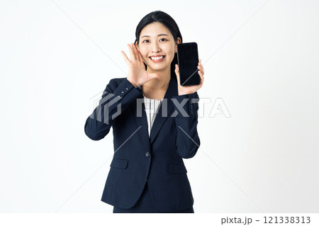 スマホを持って叫ぶスーツ姿の若い女性