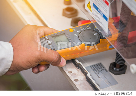 An electric meter reader checks a distribution board on red wall.