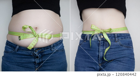 Woman before and after weight loss, weight loss. Abdominoplasty or diet aftereffect. Belly tied with measuring tape in the form of a bow