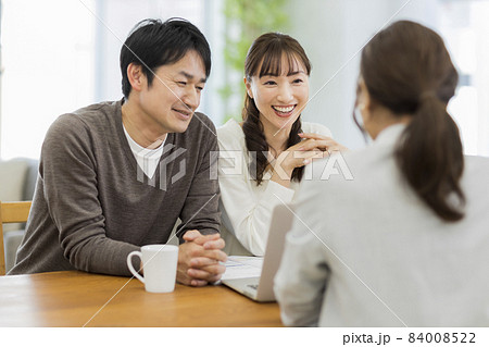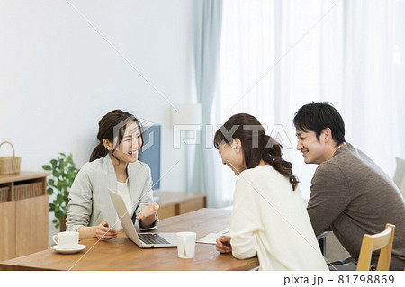 若い夫婦に説明する訪問販売員