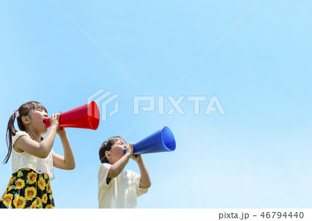 メガホンで呼び掛ける2人の子供。訴え、要求、叫ぶ、呼びかけイメージ