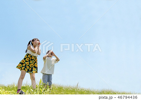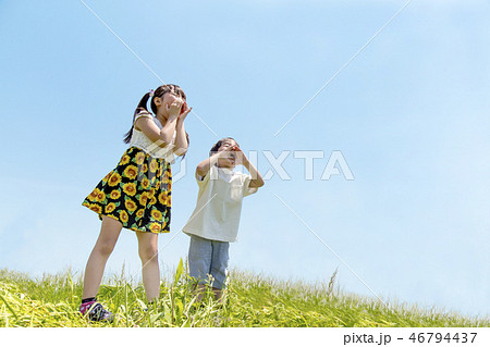 土手で呼び掛ける2人の子供。訴え、要求、叫ぶ、呼びかけイメージ