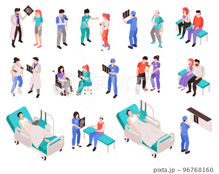 Trendy isometric people, reception, doctor discussion with the patient, surgeon, medical staff, nurse, receiving patients are isolated on a light background