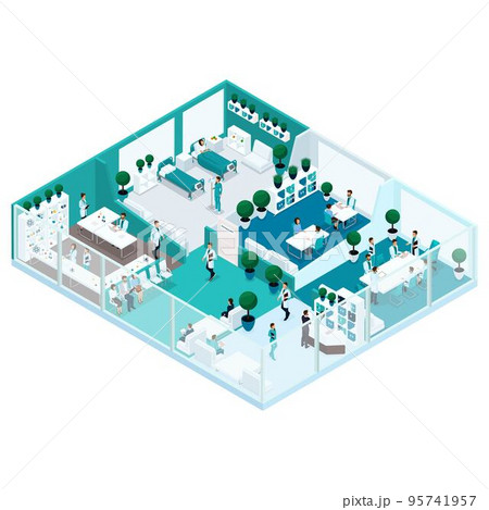 Isometric medical clinic. Hospital building. Surgery or reception rooms interior. Healthcare platform. Medicine environment or cloud. Doctors and patients. Vector assistance concept
