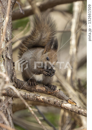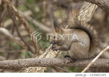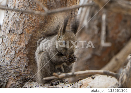 木の実を食べる春のエゾリス
