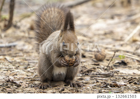 地面でク木の実を食べるエゾリス
