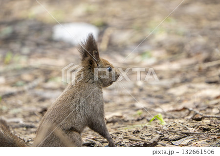 地面に降りて木の実を探すエゾリス