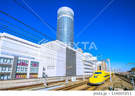 日本の横浜都市景観新時代へ。新横浜駅にさしかかるドクターイエローや横浜プリンスHなどを望む。未来へ