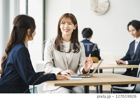 フリースペースのテーブルで商談をするキャリアウーマン