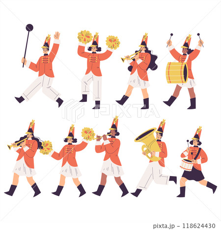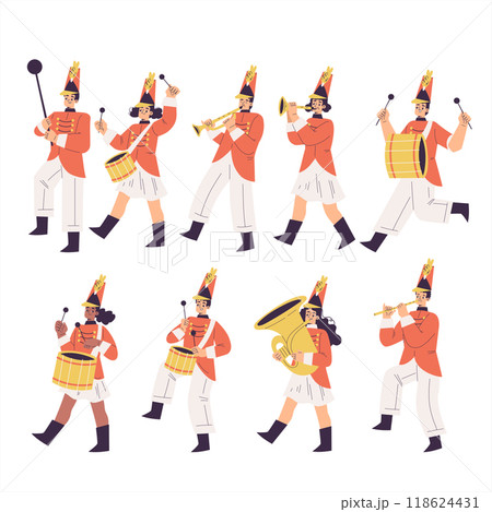 Orchestra with Marching People Character in Red Uniform with Musical Instrument Vector Set