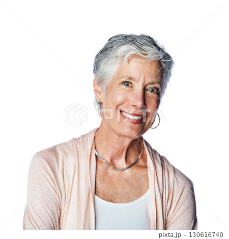 Happy, elderly and portrait of woman in studio with cheerful, optimistic and joyful smile of people. Wellness, happiness and senior retirement person with skincare on isolated white background.