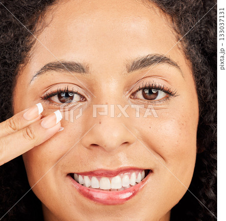 Face, skincare and portrait of black woman with cream for facial dermatology. Cosmetics, smile and happy young female model apply lotion, creme or moisturizer product for skin health and wellness.