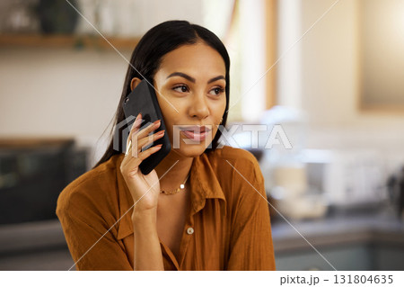 Woman, phone call and kitchen in a home with blurred background. House, female and cellphone of a young person with talking and feeling relax from mobile conversation and discussion in the morning