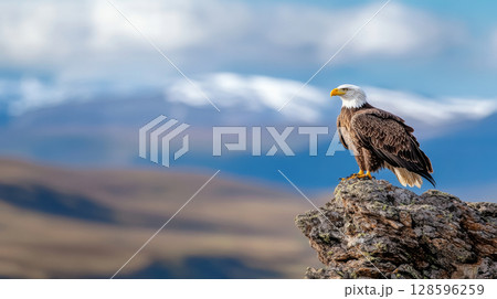 Majestic bald eagle bird perched on rocky cliff against mountain backdrop. Concept of wildlife, freedom, natural beauty, avian grace in wilderness setting. Copy space