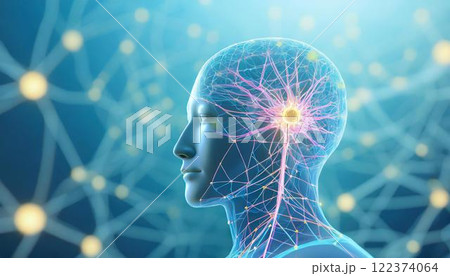 人体の神経細胞が脳内のネットワークで情報を伝達しているイメージの3Dイラスト 医療系素材