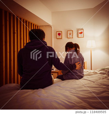 ベッドの上で抱き合うカップル 日本人 アジア人