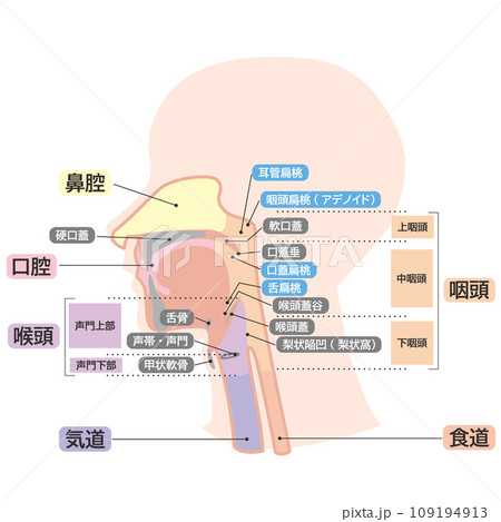 頭部の口腔鼻腔から気道食道へのシンプル解剖図イラスト