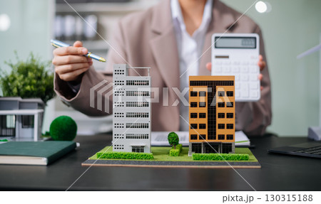balancing the property sector The real estate agent is explaining the house style to see the house design and the purchase agreement. model house and comdo