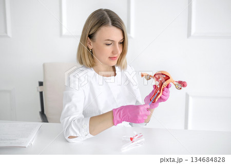 Physician gynecologist showing uterus and ovaries models