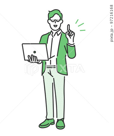 ノートパソコンを片手に持ちながら説明をするビジネスパーソンのイラスト素材