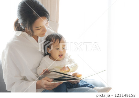育児を楽しむ母親と娘のセット 読み聞かせ 寝かしつけ