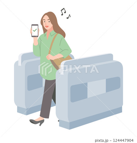 スマホで改札を通る若い女性