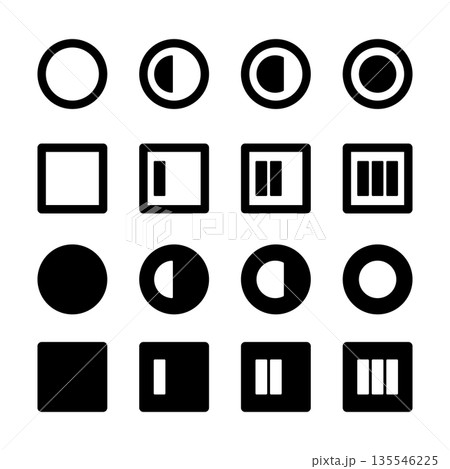 作業進捗を示すシンプルな円形と四角のアイコンセット
