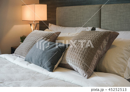 Yellow and green pillow on bed with table lamp on bedside table in modern interior bedroom.