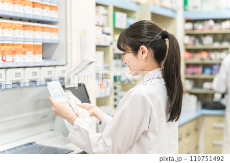 Pharmacist using a computer while managing the