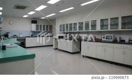 Modern Empty Biological Applied Science Laboratory with Technological Microscopes, Glass Test Tubes, Micropipettes