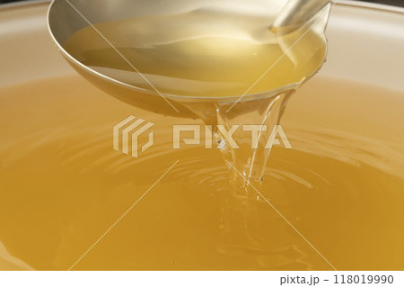 だし汁 お玉でだし汁をすくう