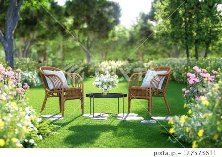 Peaceful outdoor patio with pink flowers and wooden chair in sunlit garden oasis