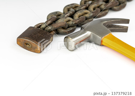 Hammer and locked padlock isolated on white background