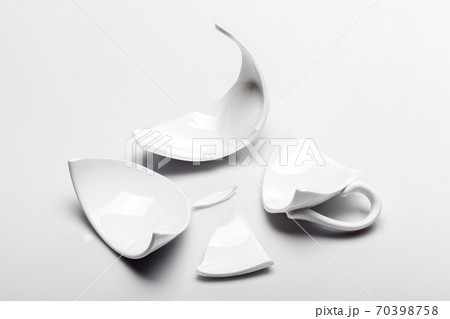 shattered white ceramic tea cup on a white background, concept on the theme of broken and ruined affairs.