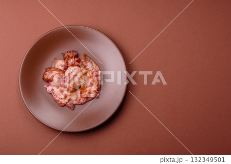Cooked crispy fried pork bacon strips for a hearty breakfast. Fried bacon strips