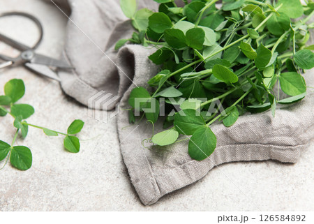 Fresh pea shoots resting on grey linen cloth with scissors